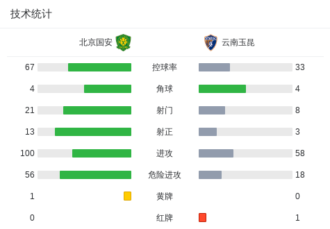 中国足协杯半决赛,北京国安与云南玉昆展开激烈对决。比赛中,林良铭送出精准传球,帮助法比奥-阿布雷乌打破场上僵局。随后,云南玉昆球员布尔克因犯规被红牌罚下,队伍陷入人数劣势。塞尔吉尼奥接连送出精妙助攻,先后助王刚和古加破门得分。上半场临近结束,张玉宁策动进攻,再次由塞尔吉尼奥送出助攻完成破门。进入下半场,张玉宁、张稀哲和冯博轩分别贡献助攻,林良铭、江文豪、张稀哲以及张玉宁相继攻破对方球门。最终,北京国安以7-0大胜云南玉昆。